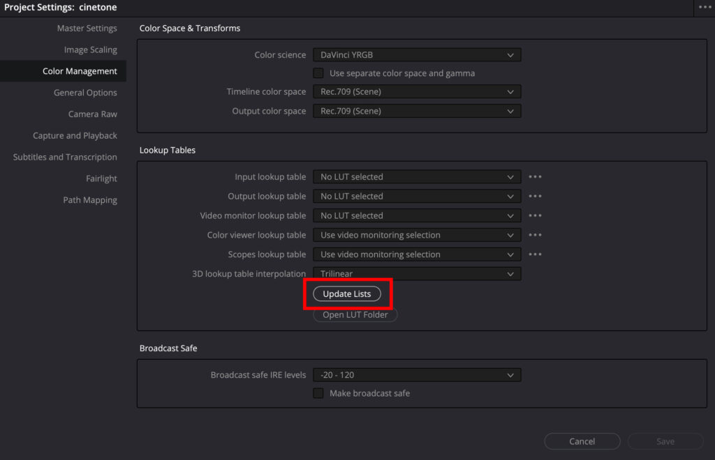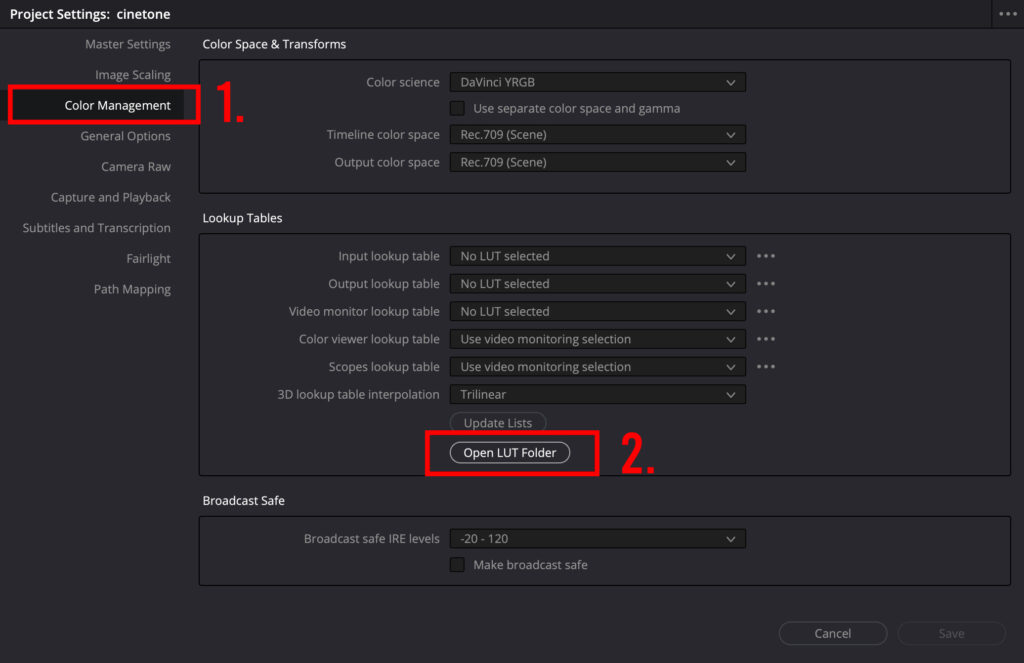 ในแท็บเมนูฝั่งซ้ายให้เลือก “Color Management” จากนั้นกดที่ปุ่ม “Open LUT Folder”