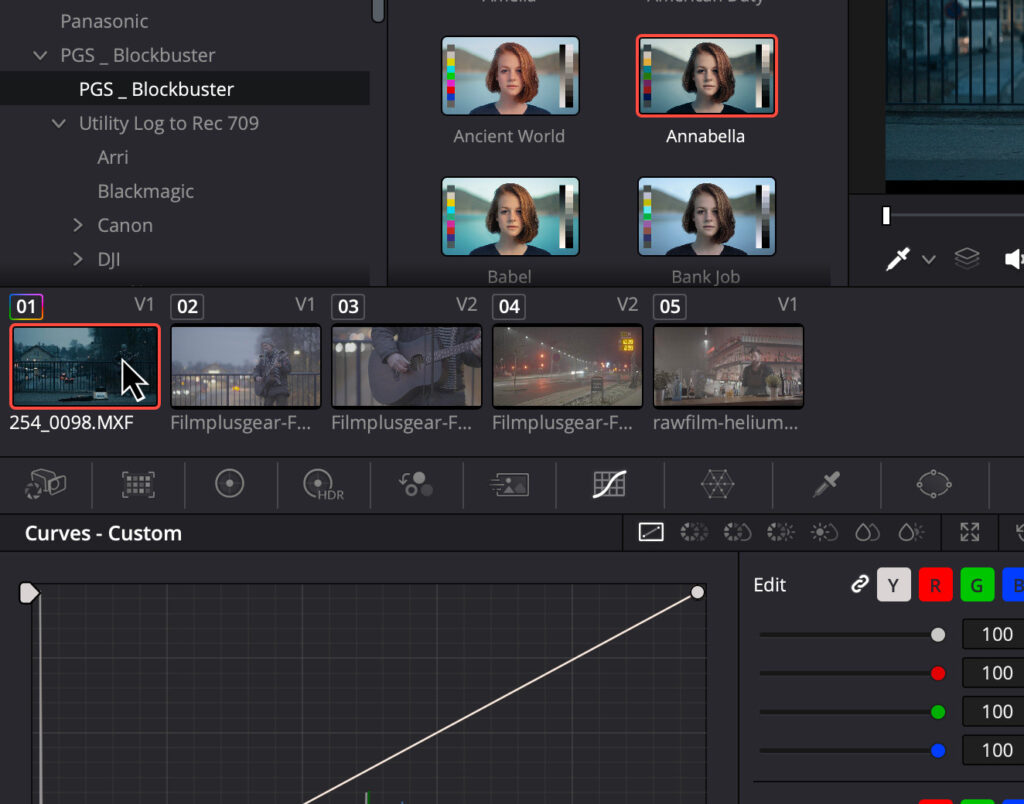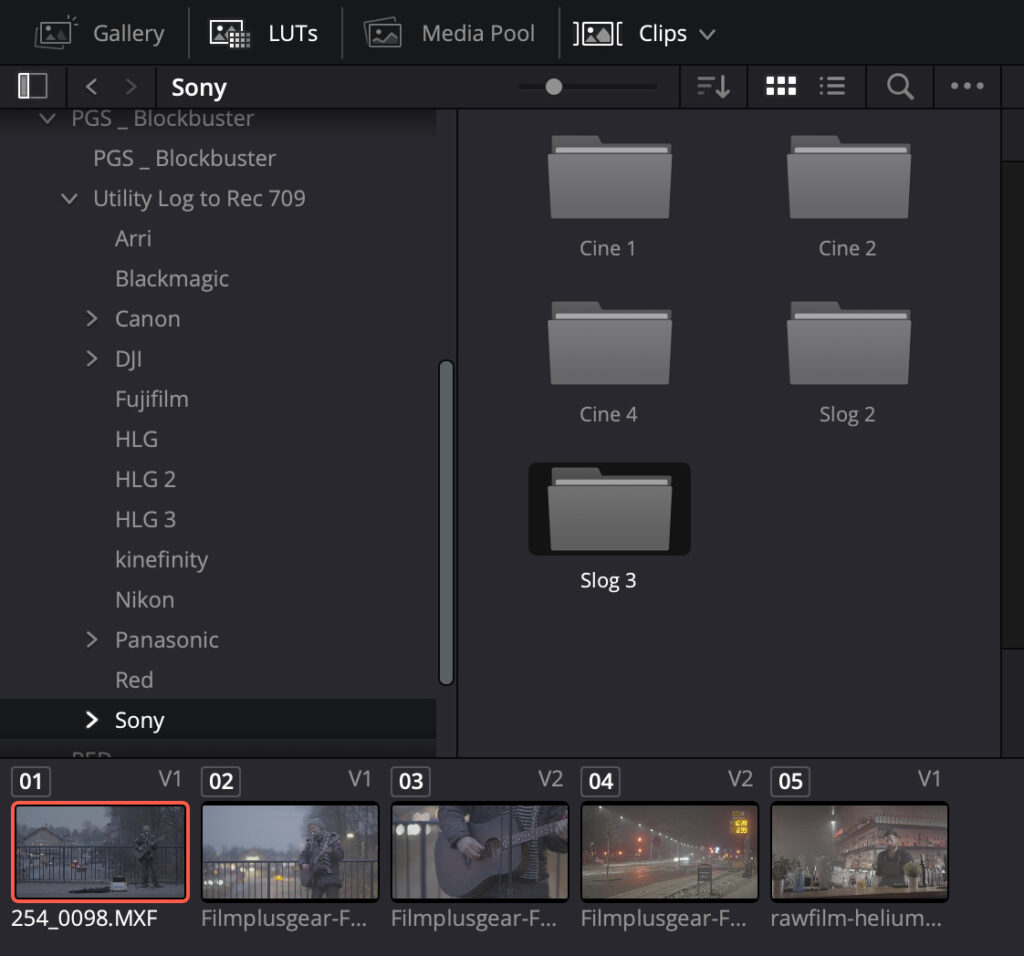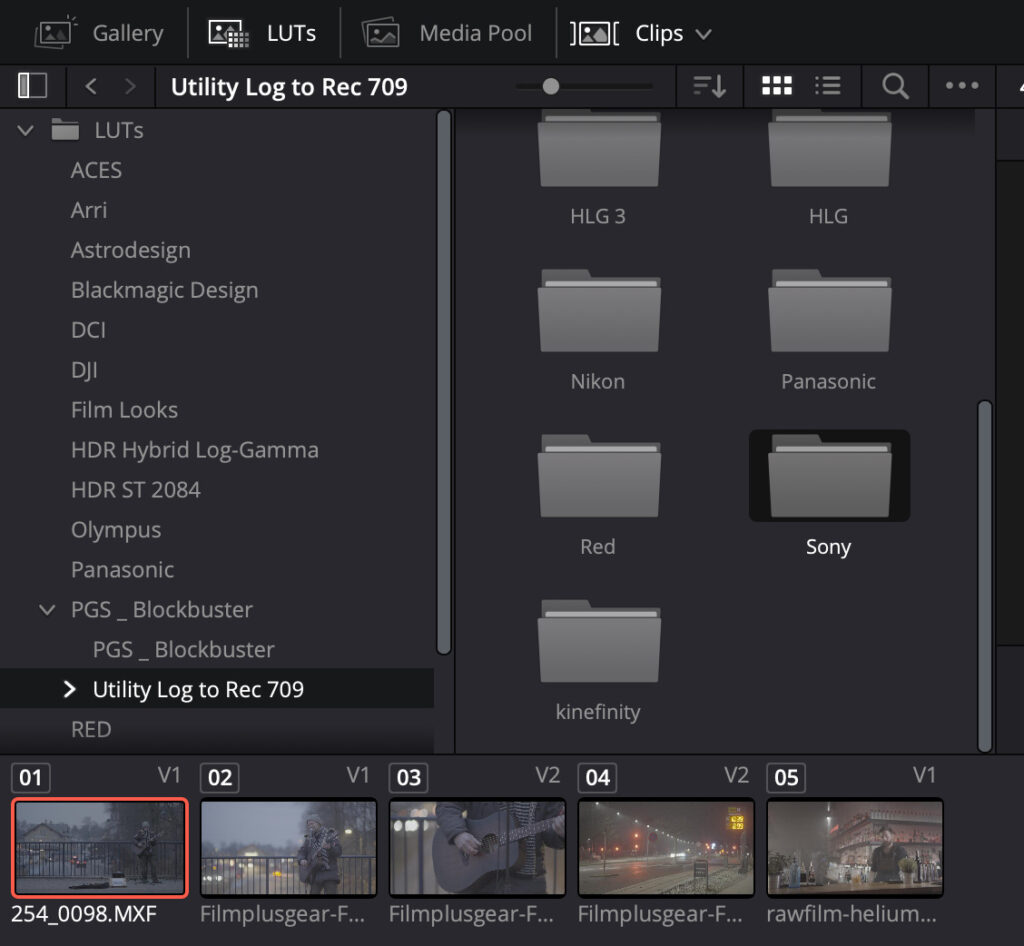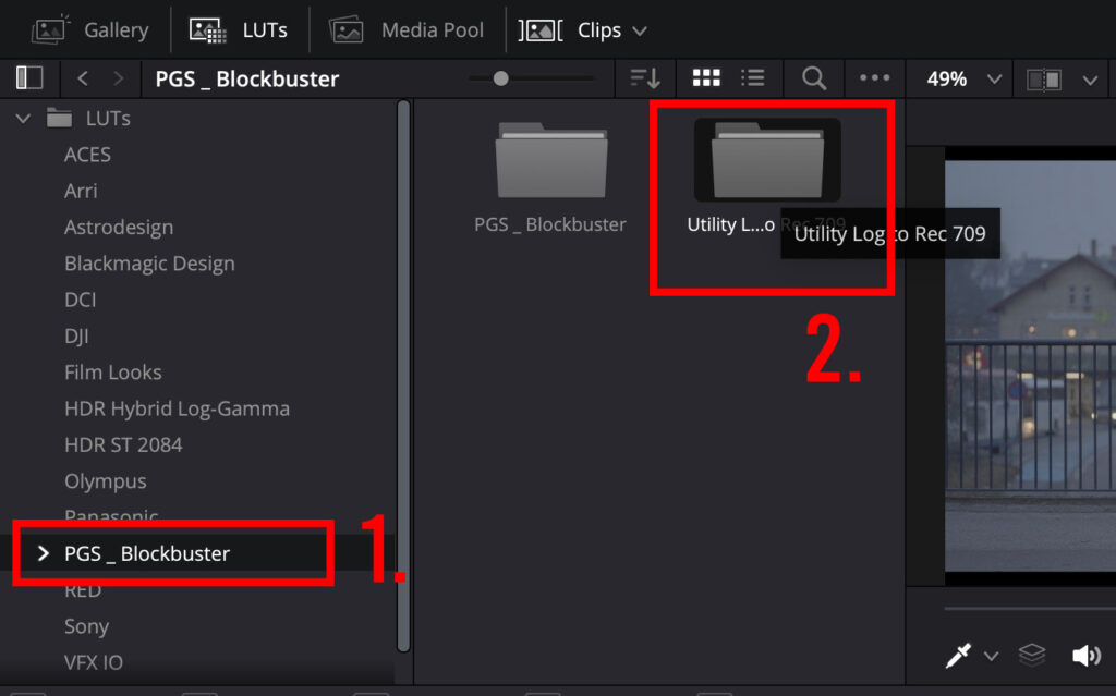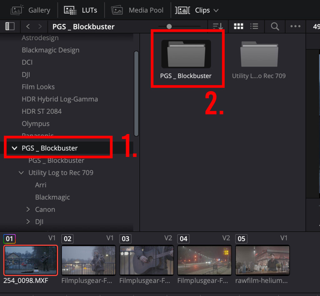 เลือนหา PGS_ Blockbuster ในแท็บเมนูฝั่งซ้าย จากนั้นกดเข้าไปที่ โฟลเดอร์ Utility Log to Rec 709