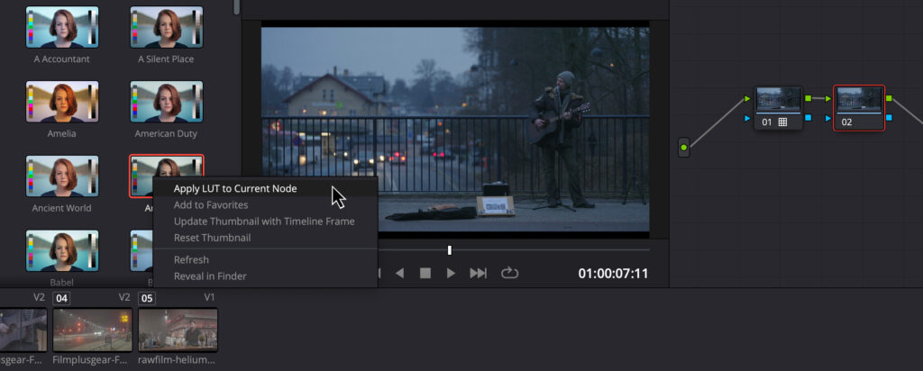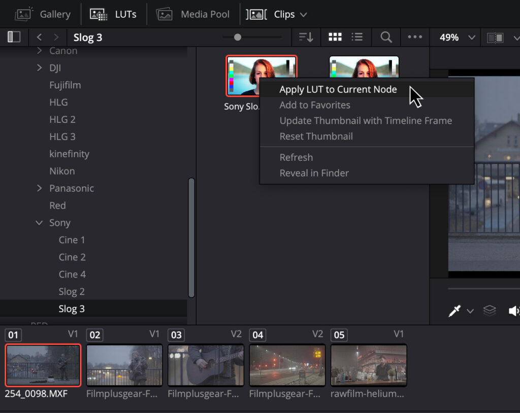 หากได้อันที่ชอบแล้วให้คลิกขวาที่ LUT แล้วเลือก “Apply LUT to Current Node”